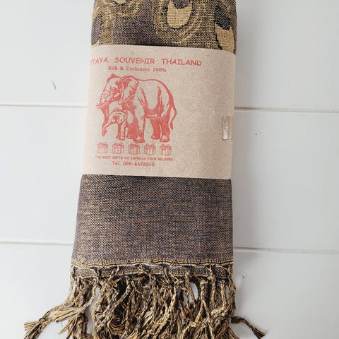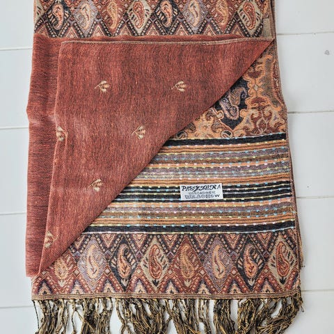Smukt og blødt tørklæde i 100 % Pashmina / Cashmere fra Thailand. Det har et flot paisleymønster med farverige detaljer, der gør det til et alsidigt tilbehør, uanset om det bruges som sjal eller tørklæde.
