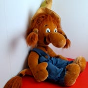 Her er en sjælden stor ' Humpe ' bamse fra den danske tegnefilmsserie " Trolderi ", som blev produceret til DR i 1999. Den måler ca. 40 cm i højden og er overordnet i rigtig god stand. Dog er der en syning, som er gået op ved venstre ben, og en tråd ved venstre hånd.