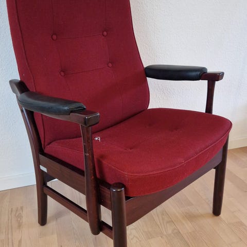 Sælger denne elegante Casa lænestol 5197 fra Farstrup, kendt for sit klassiske danske design og ergonomiske former, der sikrer en behagelig siddeoplevelse og optimal komfort. Lænestolen er fremstillet af massivt egetræ og brun læder. Læderet på armlænene har krakelering, men ellers er stolen i fin stand.