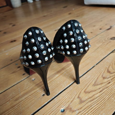 Graceland stiletter i sort og rød i størrelse 38. Disse brugte sko har en høj stilet-hæl og en plateau-sål, der giver komfort. Skoene er perfekte til en aften ude eller en særlig lejlighed, og deres iøjnefaldende farvekombination vil tilføje elegance til ethvert outfit.