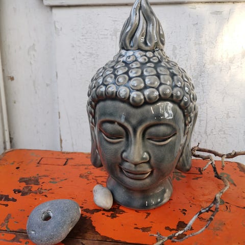 Lad dette Buddha hoved i støbejern være en kilde til inspiration og en påmindelse om mindfulness i din daglige tilværelse. Det er en symbolsk og tidløs tilføjelse til dit hjem eller dit meditationsspace.