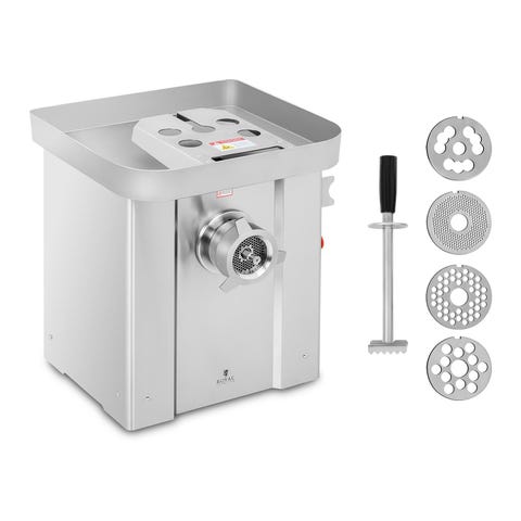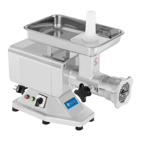 Kødhakker RCFW 120OPRO fra Royal Catering er lavet til professionel brug. Den er fremstillet i rustfrit stål og aluminium af høj kvalitet. De medfølgende kødskiver har en diameter på henholdsvis 5 og 8 mm. Skiverne er legende lette at skifte og nemme at rengøre. Inkluderet er også en kødstopper af plast. Takket være denne bliver kødet sikkert, effektivt og med et konstant tryk presset gennem kødhakkeren. Maskinen imponerer med sin funktionalitet og robuste konstruktion der næsten aldrig går i stykker. Kabinettet er lavet af førsteklasses aluminiumslegering og gummifødderne er særligt stabile og skridsikre. Kødhakker RCWF 120PRO arbejder med en bemærkelsesværdig høj effekt på 850 watt og imponerer samtidig med forbløffende lav støj. Den producerer 2 kg i minuttet.