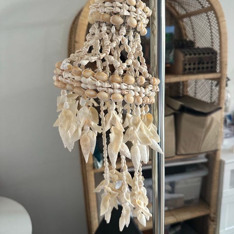 ræd ind i en verden af boheme og nostalgi med dette smukke planteophæng fra 70'erne. Hvert eneste muslingeskal er omhyggeligt udvalgt og flettet sammen i et intrikat makramemønster. Dette unikke stykke er mere end bare en planteholder – det er en tidslomme, der vil transportere dig tilbage til en tid med frie sjæle og farverige drømme. Forestil dig det hængende i dit soveværelse, hvor det vil skabe en beroligende atmosfære, eller i din stue, hvor det vil være en iøjnefaldende samtalestarter. Med dette planteophæng kan du tilføje et touch af kystinspireret charme og hippie-stil til din indretning og skabe et hjem, der afspejler din personlighed."