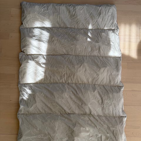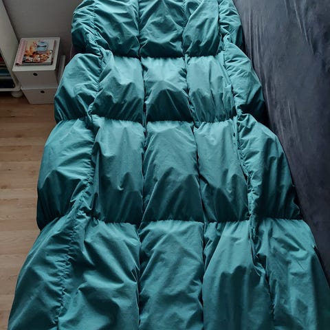 Der er ingen huller i hverken dyne eller incontinensbetræk og bæretasken er som ny. Den hvide beskyttelsespose er stadig på dynen. Den kan tages af og så er kugledyne grøn.