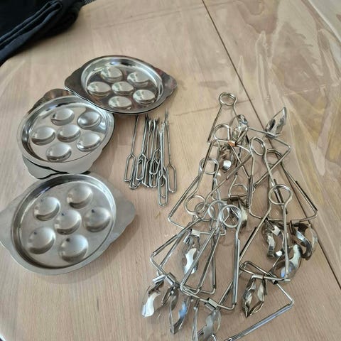 Bestik, Snegletang, 2 stk snegletang i rustfrit stål. I pæn stand.