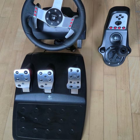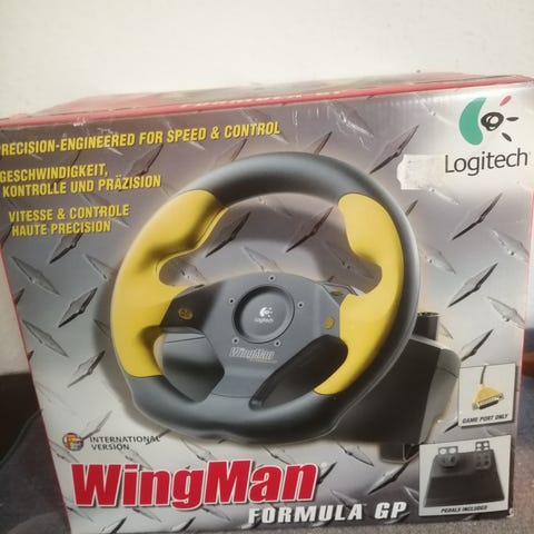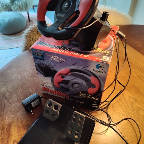 Logitech Wingman Formula Force GP, til pc, racing, Med brugs spor og så er den lille plastik klip der holder forbindelse kabel rattet knækker af men den virker stadig med lidt tape.