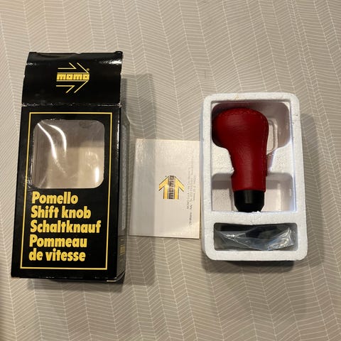 Er udført i ren aluminium, vejer 181 gram (tung) med adapter til de fleste biler og gear manchet i sort ruskind med røde syninger (brugt).sendes med GlS pakke kr 42,-
