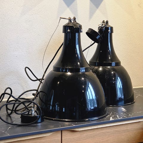 House Doctor rå industrilook lampe med wire ophæng. Total længde incl wire 104 cm. Skærm højde 37 cm Ø 40 cm.