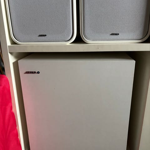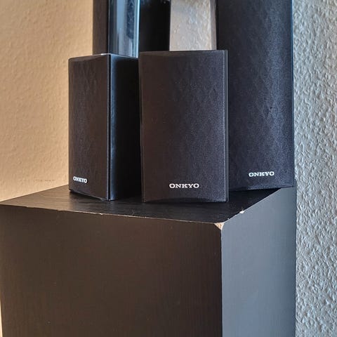 Atmos højtalere fra Onkyo med skrå hældning, der både kan hænge eller stå.. Mål: ca 15cm x 15cm x 12cm.