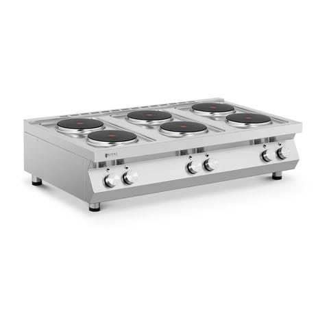 Dette højtydende køkkenapparat har fire kogeplader med en effekt på 2,600 W pr. kogeplade. Kogepladerne har en diameter på 22 cm og reguleres på knapperne på forsiden af apparatet. Med en samlet effekt på 10,400 W er kogepladen perfekt til at opfylde behovene i travle køkkener. Kabinettet er fremstillet af rustfrit stål og kogepladerne af støbejern, materialer som er nemme at rengøre efter brug. Fødderne sørger for at kogepladerne står stabilt på arbejdsbordet, samtidig med at arbejdsbordet bliver nemmere at rengøre.