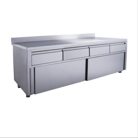 Arbejdsskabet med 3L+3R skuffe og skydelåger med kant – 180 x 70 x 85 cm er en uundværlig tilføjelse til ethvert professionelt køkken. Dette skab kombinerer holdbarhed, funktionalitet og stil på en måde, der gør det ideelt til brug i travle køkkener, hvor effektivitet og hygiejne er afgørende.