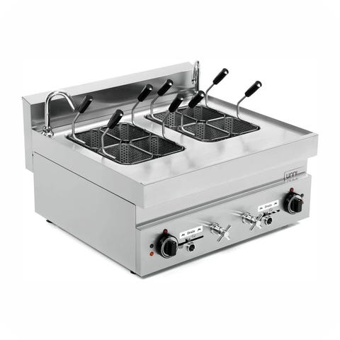 Denne industrielle pastakoger er designet med fokus på både funktionalitet og brugervenlighed. Den intuitive betjeningspanel giver kokken fuld kontrol over temperaturen og kogningstiden, så pastaen altid bliver tilberedt til perfektion. Det rustfri stålkonstruktion sikrer holdbarhed og let rengøring efter brug, hvilket sparer tid og besvær i køkkenet.
