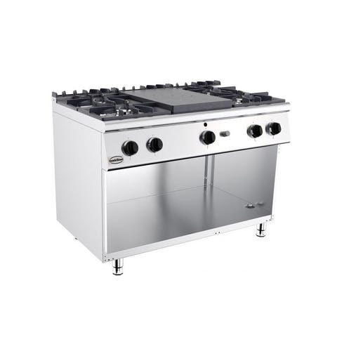 Vores industrielle gaskomfur er bygget til at håndtere selv de travleste køkkener. Med et helt rustfrit stålhus og kraftige brændere tilbyder dette komfur en solid konstruktion, der kan modstå selv de mest intense madlavningssessioner. De 4 kraftfulde brændere leverer en samlet gas effekt på 32,0 kW, hvilket sikrer en hurtig og effektiv opvarmning af dine gryder og pander.