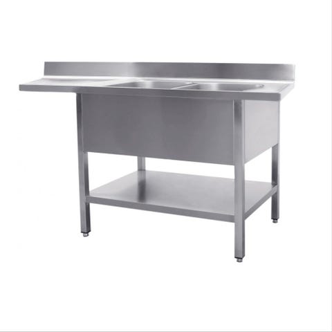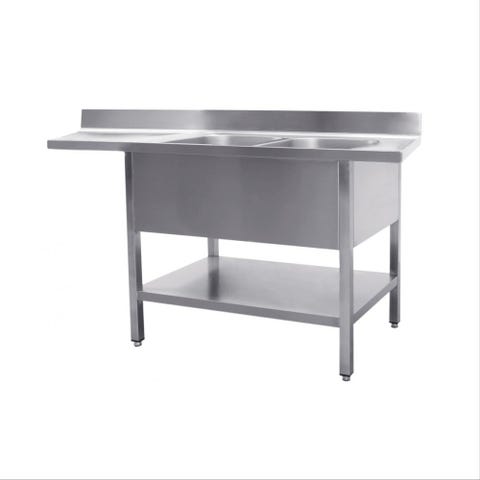 Dette bord med vask og ekstra hylde er skabt til at imponere med sin soliditet og rummelighed. Med en vægt på 71 kg og dimensioner på B 1600mm x T 700mm x H 850mm er det en imponerende tilføjelse til ethvert køkken. Dette møbel er både en funktionel arbejdsstation og en stolt udstillingsgenstand.