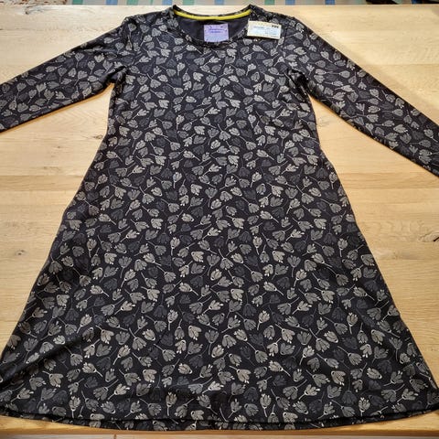 Gudrun Sjöden kjole "Tulipe" S. NY MED MÆRKE. Jersey, sort med fløde. A-facon. Bryst 41cm. Hofte 52cm. Nederste kant 72cm. Længde 96,5cm. Nypris 495,-. Vejer 140g.