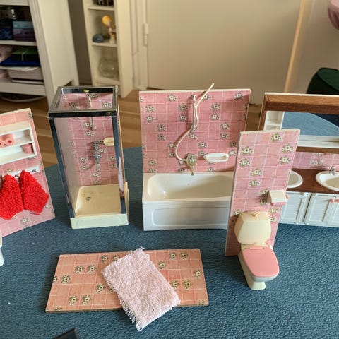 Forrygende badeværelse fra Lundby. Fra start 70'erne. Bemærk at fars barbermaskine ligger til opladning, samt at toiletbørsten også følger med:-)