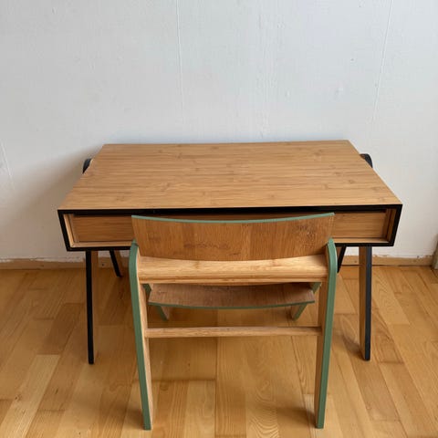 Skrivebord, We do Wood, Lille skrivebordssæt fra We Do Wood i form af bord og stol. I bordet er der udtræksskuffe til opbevaring. Med brugsspor men stadig velholdt. Bord og stol sælges kun samlet.