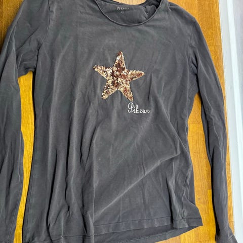 Fin ridebluse i sort stretch materiale med små simili sten på kraven og på ærmet. Str. 36 (normal i størrelse).