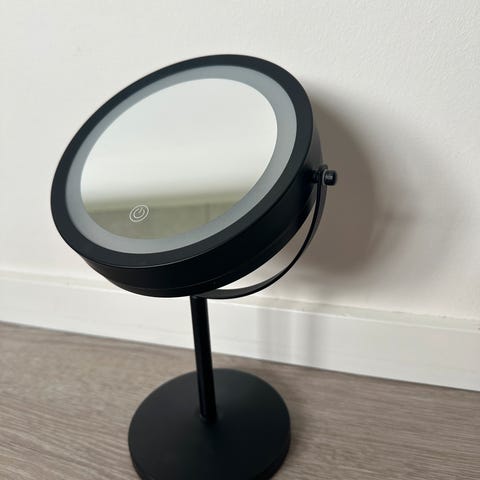 Fint makeup spejl med almindelig spejl og forstørrelse på den anden side. Sort pulverlakeret på fod med vippefunktion. Brugt men fin stand, se billeder. Afhentes i Aalborg vestby. Sender ikke.
