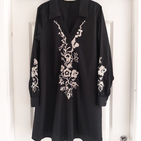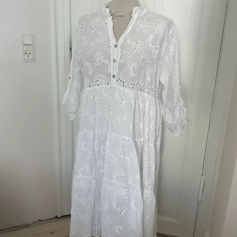 Kjole i broderie anglaise. kjolen har underskørt i bomuld. - V-udskåret halsudskæring. Knaplukning ved fronten.