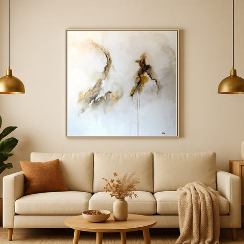 Dette abstrakte akrylmaleri (1 x 1 meter) er skabt med fokus på varme, dybde og bevægelse. De sorte og gyldne toner flyder som regn eller tårer hen over lærredet og skaber en rolig, sanselig stemning. Tekstur og guld giver maleriet liv og gør, at det forandrer sig i lyset – en levende tilstedeværelse i ethvert rum.