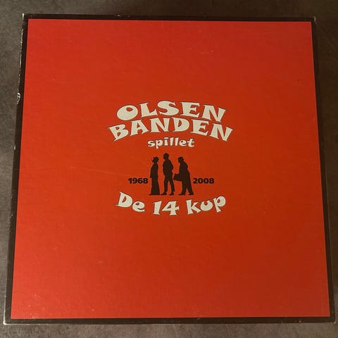 Olsen Banden De 14 Kup brætspil i rød farve. Spillet er baseret på den populære filmserie og indeholder et spillebræt, kort og instruktioner. Velegnet til fans af Olsen Banden og brætspil.