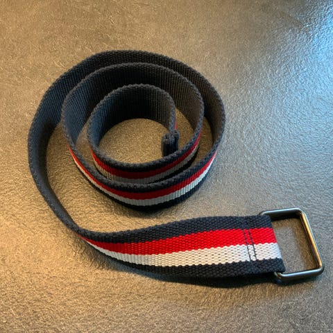 Super flot bælte der er flettet af røde og blå stoffer og bæltet er elastisk så det ikke strammer og så det passer både medium og Large størrelser .