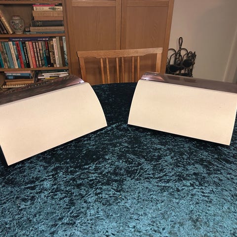 Defekt Beolab 2 (det er lågen som driller) og to velfungerende Beolab 6000 i fin vinrød farve. Den ene højtaler har en skramme (se foto)