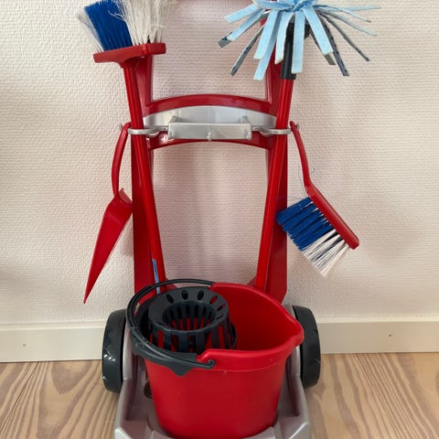 Med en legevogn fyldt med rengøringsredskaber som en kost, støvsuger, støvpande og moppe kan børnene lege med at holde huset rent og pænt.