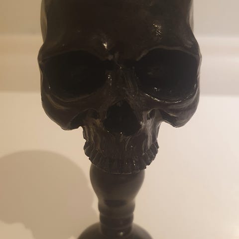 Flot sort kranie fyrfadslysestage fra Shein. Tror den er lavet af resin. Den vejer ikke ret meget. Kun brugt som ring holder. Der er huller ned til og igennem øjnene.
