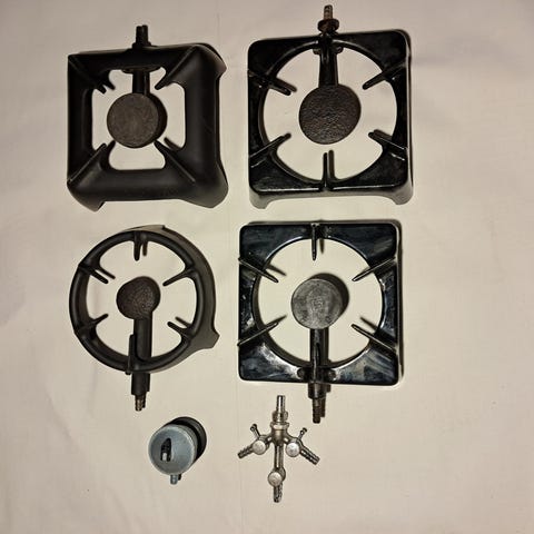 Alt fuldt funktionsdygtigt. 4 gasblus - 1 stor, 2 mellem og en lille. Keramisk udenplade med matchende bordgrill med lavesten. Underpladen har en flænge bagerst ( se foto) men det har ingen funktionseffekt. Hele løsningen måler 108 cm i bredden og 52,5 i dybden. Sælges enten samlet eller hver for sig - prisen her er den samlede.