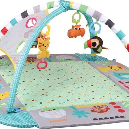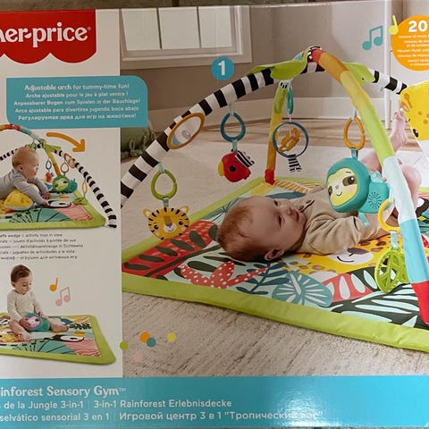 Fisher-Price 3-i-1 Rainforest Sensory Gym vokser med din baby fra nyfødt til småbørn, og byder på vilde sensoriske lækkerier undervejs. Nyfødte kan ligge på den bløde legemåtte med 6 legetøj hængende på buerne over hovedet. Til mavetid kan den justerbare bue glide ned for at bringe legetøjet inden for rækkevidde, mens girafkilen hjælper med at støtte din baby, mens den leger. Plus, Music & Lights Sloth-legetøjet holder legetiden spændende, mens din baby vokser fra mavetid til at sidde og rejse lege.