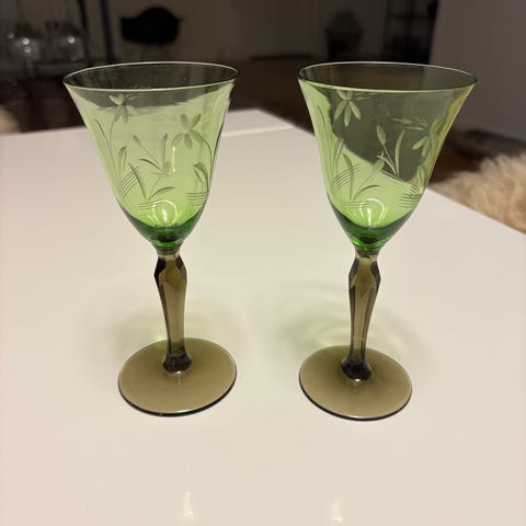 Med en højde på 16,5 cm fremstår begge glas i perfekt stand, uden afslag, revner eller slitage. De repræsenterer en periode, hvor Kastrup Glasværk var blandt de førende producenter af dekorative og funktionelle glasvarer i Danmark. Modellen er kendt fra samtidige kataloger og blev fremstillet med et bredt udvalg af deviser, hvor “Til Lykke” hører til de mere sjældne og eftertragtede.