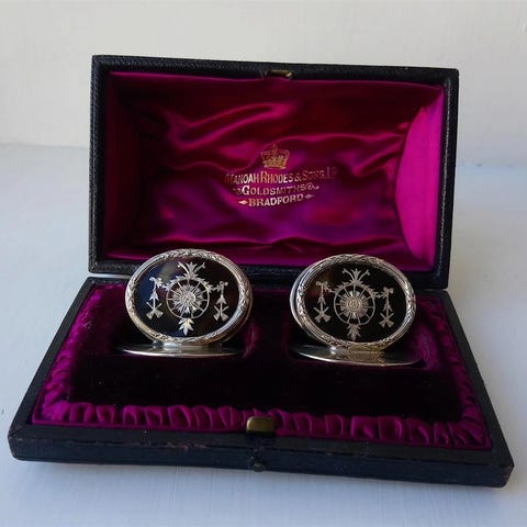 A set of Edwardian silver and tortoiseshell menu holders, hallmarked William Comyns, Birmingham 1910, in retailers case from Manaoh Rhodes and Sons Ltd., Diamant Merchant, Goldsmiths and Jewelers, Bradbury. H: 3.3 cm L: 4 cm W: 3.3 cm