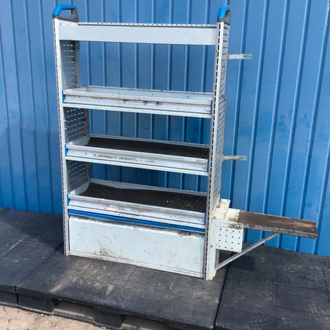 Værkstedsreol med flere skuffer i blå og grå metal. Reolen har mange udtræksskuffer i forskellige størrelser, som egner sig til opbevaring af værktøj, smådele eller tilbehør i værksted, garage eller hobbyrum. Overdelen har en åben hylde til ekstra opbevaring eller arbejdsflade. Konstruktionen er i metal med greb på hver skuffe for nem betjening.
