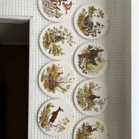 5 platter med dyr- og naturmotiver fra jagtens verden.