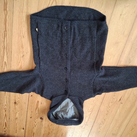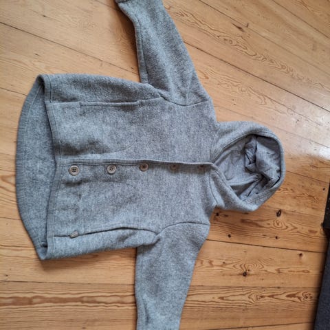 Lækker Cosilana-jakke i str. 74/80 lavet af naturlige materialer: 60 % økologisk merinould (k.b.T.) og 40 % økologisk bomuld (k.b.A.). Jakken har en god pasform med bred rib ved ærmerne og hætte. Lukkes med fine træknapper foran.
