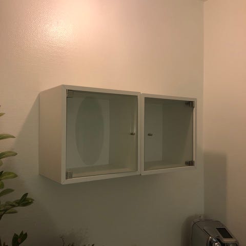 Nemt at hænge op. Der medfølger 3 lister som hænges op på væggen. Skabene kan derefter sættes op på listerne.