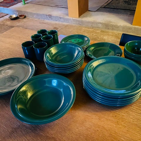 Smukt Japansk keramiksæt, brugt 1 gang til konfirmation. Haves: 36 sæt sælges minimum 2 sæt af gangen. Kan afhentes i Valby. I original emballage. Pris er pr sæt med 4 skåle, 1 aflang tallerken og 2 sæt træpinde.