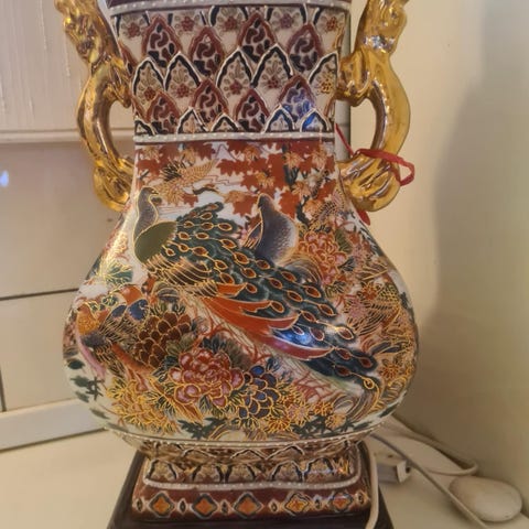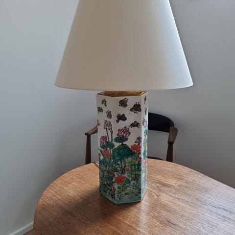 Kinesisk lampe med sommerfuglemotiv og fod af træ. Fin lampeskærm af silke. Virker fint. Fra et ikke-ryger hjem.