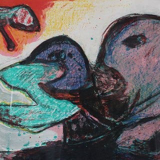 Billedet viser et litografi kaldet "Væsner i Mol" af den danske kunstner Mogens Balle. Balle var en del af COBRA-bevægelsen og var kendt for sine abstrakte og fabelfigur-inspirerede værker.