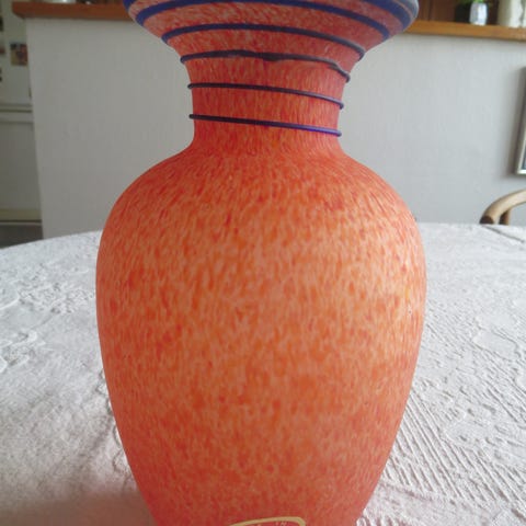 Høj, flot, slank, anderledes Murano-vase i skønne blålige, grønlige, rødlige og mathvide farver. Til en enkelt blomst eller helt uden til dekoration. Så flot en krans foroven. Højde 30 cm, bredest 12 cm ca. - Signeret "R.C.R Murano"