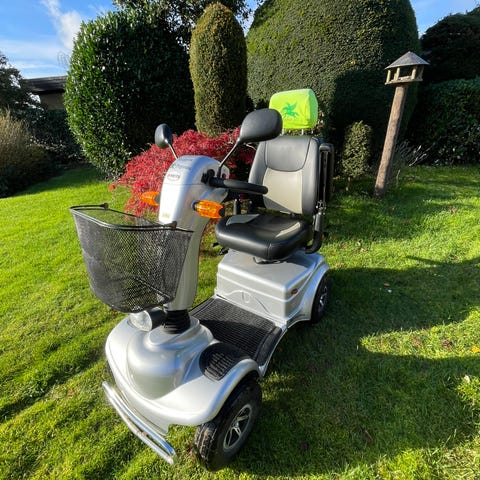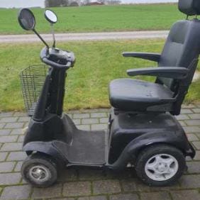 El scotter..Den har virket indtil batterierne virkede..Meget stærk motor..Der følger lader med den kosterede 2000 kr fra ny af..Skjoldet har lidt skammer....Der nøgle med..