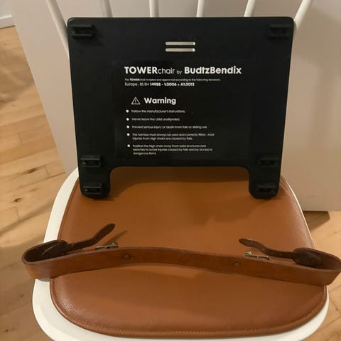 Tower chair højstol fra Budtzbendix i grå. Der følger også bakke og rem med til, når de er helt små (se billede).