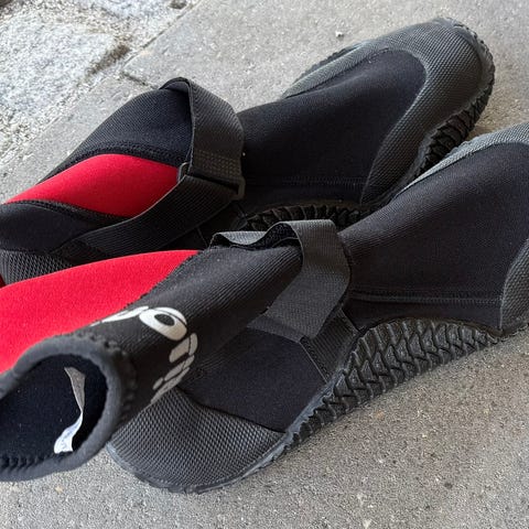Kajakstøvler, NRS Titanium i neopren. US13 svarer til str. 47 eller 46 med en tyk sok. Meget lidt brugt, helt tætte og uden fejl. Relativt kraftige/varme. På grund af det høje skaft er de velegnede, hvad kajakken sættes i vandet fra stranden.