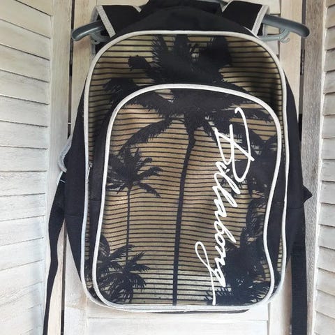 Skoletaske, Billabong, b: 40 l: 26 h: 47, Rygsæk med 8 rum. Slid nogle steder ved den blå kant ellers ok stand. Lynlåse virker selvfølgelig. Justerbare skulderremme.