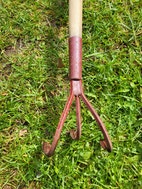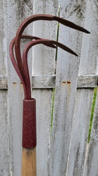 1 stk. LYSBRO .- Denne 3-tandet kultivator kan anvendes både til at bekæmpe ukrudt og til at lufte jorden. Det solide træskaft sikrer en god arbejdsstilling og gør det muligt at hænge riven op efter brug. Skaftet måler 130 cm. God brugt stand. Pris - 70 kr.