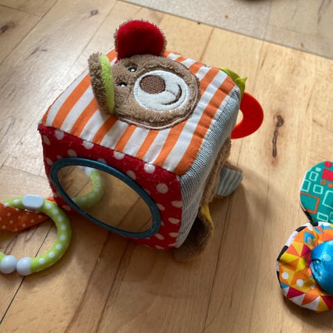 Der er lomme inden i den smarte taske der kan lukkes sammen med lynlåsen. Der er plads til mere legetøj , nem at tage med på turen.