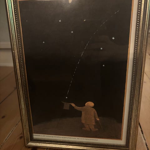 Vagabond nyder solen. Tryk, signeret Storm P. I god stand, bag glas, med sort ramme. Rammemål 33x43. Evt. forsendelse + porto.