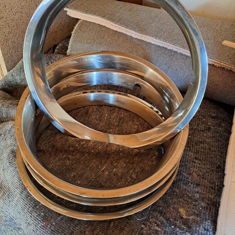 Fine fælgringe i rustfri stål til 14" stålfælge, muligvis til Volvo.
